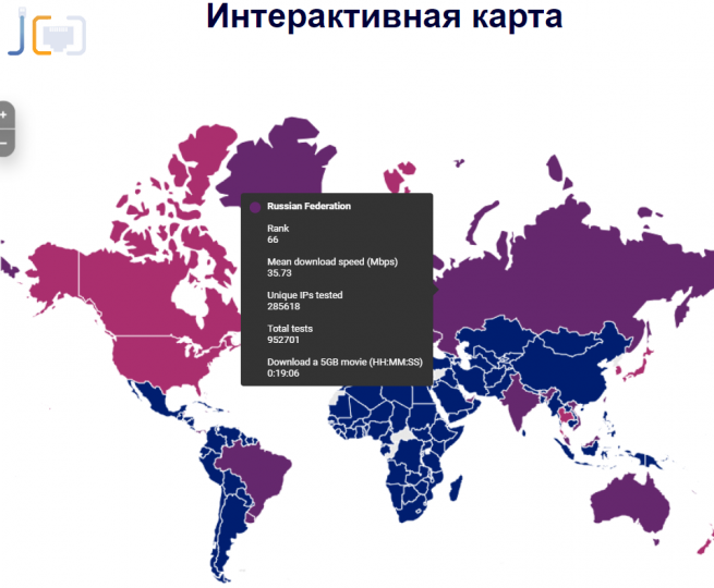 Для наглядности, карта так же сообщает место страны в рейтинге скорости и сколько понадобится времени на скачивание из интернета фильма, который весит 5 Гб. Показатель скорости – среднее значение более сотни замеров за месяц.