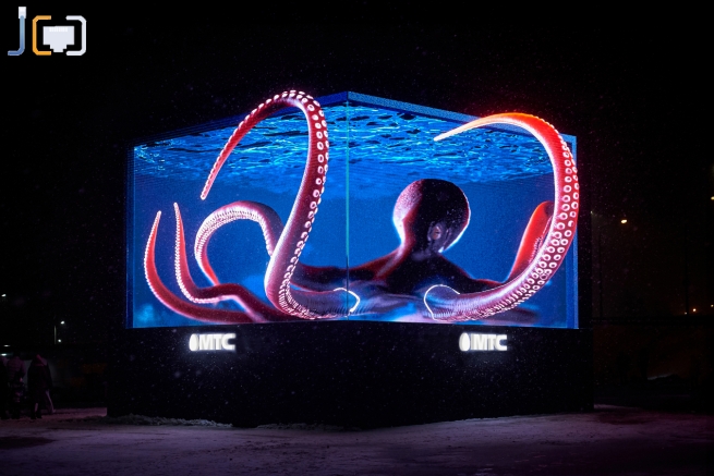 В подмосковном Одинцово МГТС (или МТС на новый лад) установил пилотную площадку для 3Dрекламы. 7-метровый куб при помощи оптических иллюзий создает эффект огромных объемных предметов, которые можно потрогать. Кажется, что картинка выходит за пределы экранов и движется, настолько реалистично, что это можно смело назвать предшественником голограммы.